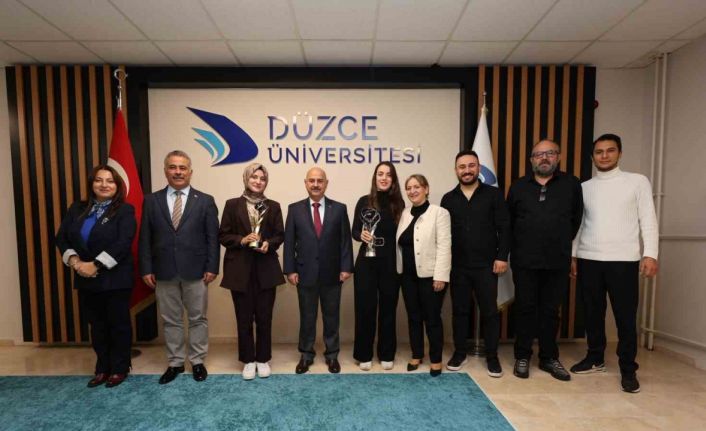 Rektör Nedim Sözbir; TRT Geleceğin İletişimcileri Yarışması’nda Video Haber kategorisinde “Yer Altında Temizlik” projesiyle birincilik ödülü kazanan Düzce Üniversitesi Radyo, Televizyon ve Sinema Bölümü öğrencisi Dilara Salman ile “Yüksek Gerilim” projesiyle ikincilik ödülü kazanan Düzce Üniversitesi Radyo, Televizyon ve Sinema Bölümü öğrencisi Melisa İrem Güner’i tebrik ederek başarılarının devamını diledi.