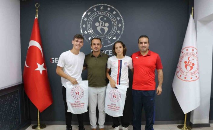 DÜZCE(İHA) – Bursa’da düzenlenen İşitme Engelliler Güreş Türkiye Şampiyonasında madalya alan Düzceli sporcular Salih Birinci ve Yunus Emre Caklı, Düzce Gençlik ve Spor İl Müdürlüğü’nü ziyaret etti.