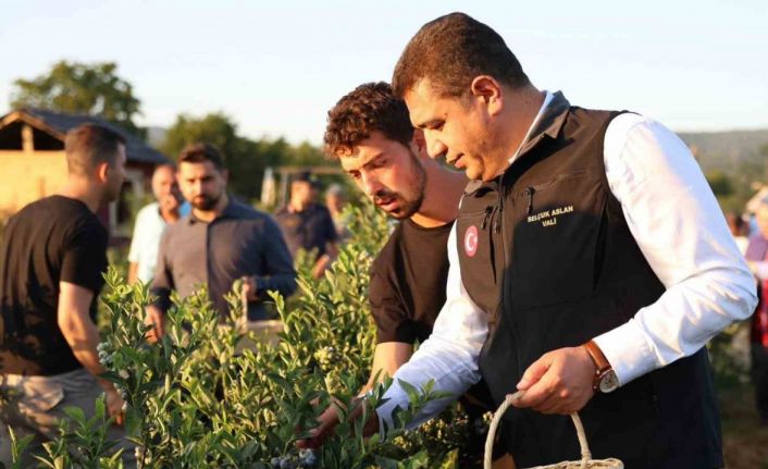 Düzce’de üniversiteli girişimcinin yetiştirdiği yaban mersinlerinin ilk hasadını Vali Selçuk Aslan elleriyle yaptı.