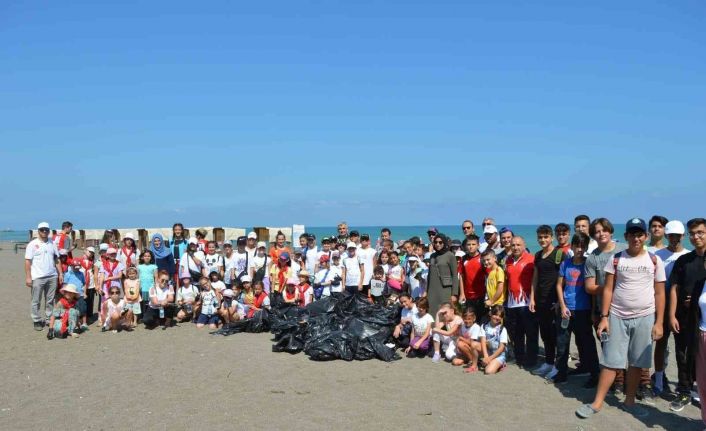 DÜZCE(İHA) – Düzce’nin Akçakoca ilçesinde yaz spor okulu ve Kuran kursuna giden öğrenciler temiz bir çevre için sahile girdiler, 1,5 ton plastik, metal ve cam atık topladılar.