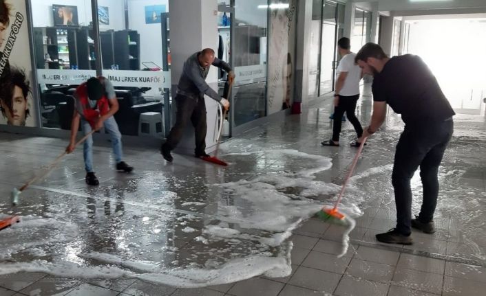 Kaynaşlı Belediyesi Temizlik İşleri Müdürlüğü ekipleri tarafından, ilçe merkezindeki iş merkezinde dezenfektasyon çalışmaları yapıldı. İş merkezinde bulunan işletme sahipleri de ekiplerin temizlik çalışmalarına destek verdi. İş merkezi köpüklü su ile yıkanarak temizlendi. Kaynaşlı Belediyesi ekiplerinin her ay düzenli olarak iş merkezini temizlemeyi hedefledikleri belirtildi.