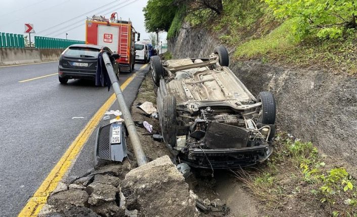 Düzce’de virajı alamayan sürücü su kanalına girerek ters döndü.