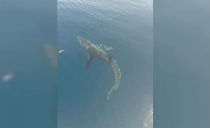 Tekneleri ile Saros Körfezi sahiline kıyısı bulunan Erikli köyü sahili açıklarına açılan balıkçılar, suyun yüzeyinde yaklaşık 2,5 metre uzunluğundaki köpekbalığını görünce şaşırdı. Balıkçılardan biri cep telefonu ile bu anları kaydederken, köpekbalığı bir süre sonra gözden kayboldu.