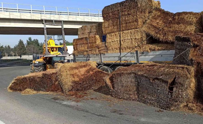 Kamyonla birlikte yolda kalan balyalar daha sonra bir yükleme aracı ile yol kenarına kaldırılırken, bölgeye gelen polis ekipleri de yol temizlenene kadar trafiğin güvenli bir şekilde akışını sağladı.