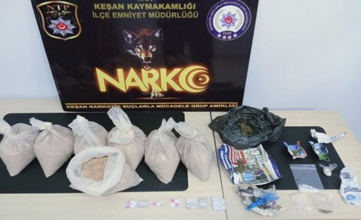 Keşan’da uyuşturucu madde ile mücadelesini sürdüren Keşan İlçe Emniyet Müdürlüğü Narkotik Suçlarla Mücadele Grup Amirliği ekipleri, Yenimescit Mahallesi üzerindeki bir adrese baskın yaptı. U.K. ve Ö.K. isimli şahıslara ait olan evde yapılan aramalarda, 7 ayrı poşet içinde 6 kilo 400 gram eroin maddesi, 15.53 gr esrar maddesi, 8.58 gram metamfetamin, 7.21 gram kenevir tohumu, 1 adet kağıda sarılı 5.23 gr. esrar, 1 adet kağıda sarılı 0.72 gr. esrar, 11 adet sentetik ecza ve uyuşturucudan elde edildiği düşünülen 9 bin 625 lira para ele geçirildi.