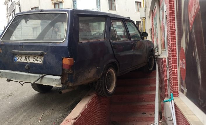 Edirne’nin Keşan ilçesinde yokuş yukarı çıkarken yoldan çıkan otomobil, merdiven trabzanlarını kırarak bir marketin camına çarptı.