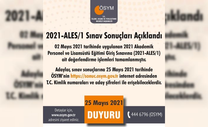 Ölçme, Seçme ve Yerleştirme Merkezi (ÖSYM) Başkanlığı, 2021 Akademik ve Lisansüstü Eğitimi Giriş Sınavı’nın (2021-ALES/1) sonuçlarının açıklandığını duyurdu.