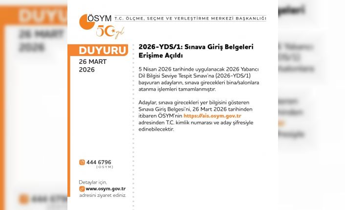 Ölçme, Seçme ve Yerleştirme Merkezi (ÖSYM), 2026-YDS/1: sınava giriş belgelerinin erişime açıldığını bildirdi.