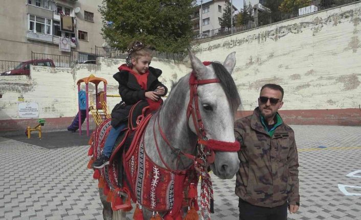 Gümüşhane’de anaokulu öğrencileri hayvan sevgisini atlarla tattı. Okul bahçesine gelen atlara binmek için birbiriyle yarışan miniklerin heyecanı renkli görüntüler oluşturdu.