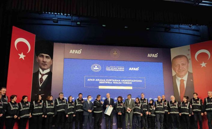 İçişleri Bakanı Süleyman Soylu, AFAD Akreditasyon sürecini tamamlayan 7 STK ve bazı belediyelerin arama kurtarma ekiplerinin sertifikalarını AFAD’ta düzenlenen törenle takdim etti.