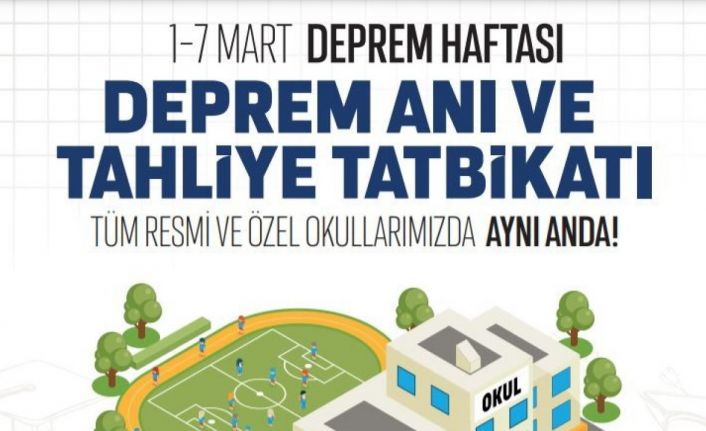 1-7 Mart Deprem Haftası nedeniyle Afet ve Acil Yönetimi Başkanlığı (AFAD) tarafından Türkiye’deki tüm okullarda 4 Mart Cuma günü saat 11.30’da “Deprem Anı ve Tahliye Tatbikatı” yapılacak.