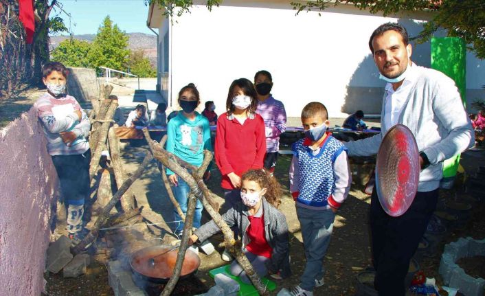 Amasya’da köy okulundaki bir öğretmen, okul bahçesinde oluşturduğu doğa sınıfında odun ateşinde pişirdiği çorbayı öğrencilerine ikram etti. Sınıfı doğaya taşıyan genç öğretmen öğrencilerine çorbaların yanı sıra tatlı ve çeşitli yemekler de yapmayı planlıyor.