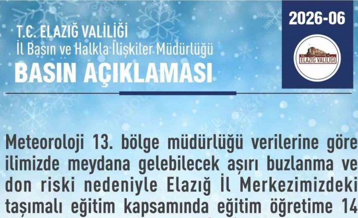 Elazığ Valiliği’nden yapılan açıklamada, "Meteoroloji 13. Bölge Müdürlüğü verilerine göre ilimizde meydana gelebilecek aşırı buzlanma ve don riski nedeniyle Elazığ il merkezimizdeki taşımalı eğitim kapsamında eğitim-öğretime 14 Ocak 2026 Çarşamba günü bir gün süre ile ara verilmiştir" denildi.