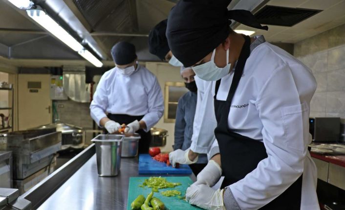 Kocaeli’nin Kartepe ilçesinde bulunan meslek lisesinin uygulama otelinde çalışarak, sektörle tanışan öğrenciler, ilçede taşımalı sistemle eğitim veren okulların öğle yemeğini çıkarıyor. Sabah erken saatlerde otelin mutfağına giren öğrenciler, her gün 500 kişilik 3 çeşit yemek hazırlıyor.