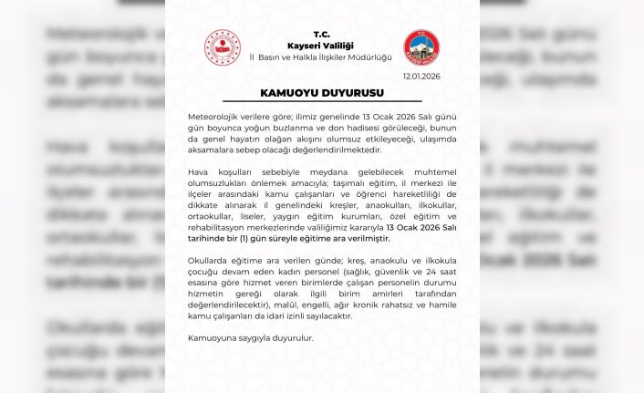 "Hava koşulları sebebiyle meydana gelebilecek olumsuzları önlemek amacıyla taşımalı eğitim, il merkezi ile ilçeler arasındaki kamu çalışanları ve öğrenci hareketliliği de dikkate alınarak il genelindeki kreşler, anaokulları, ilkokullar, ortaokullar, liseler, yaygın eğitim, özel eğitim ve rehabilitasyon merkezlerinde valiliğimiz kararıyla 13 Ocak Salı günü eğitime 1 gün süreyle ara verilmiştir."