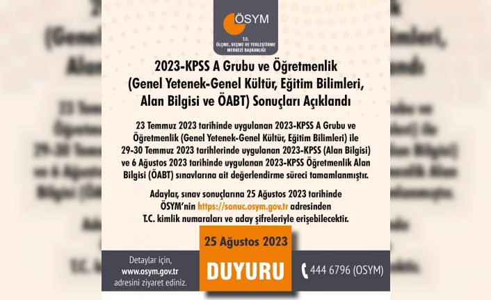 ÖSYM tarafından yapılan açıklamada, 23 Temmuz 2023 tarihinde uygulanan 2023-KPSS A Grubu ve Öğretmenlik (Genel Yetenek-Genel Kültür, Eğitim Bilimleri) ile 29-30 Temmuz 2023 tarihlerinde uygulanan 2023-KPSS (Alan Bilgisi) ve 6 Ağustos 2023 tarihinde uygulanan 2023-KPSS Öğretmenlik Alan Bilgisi (ÖABT) sınavlarına ait değerlendirme sürecinin tamamlandığı belirtildi. Adayların sınav sonuçlarına ÖSYM’nin https://sonuc.osym.gov.tr adresinden T.C. kimlik numaraları ve aday şifreleri ile erişebileceği kaydedildi.