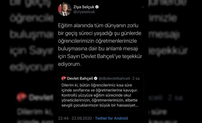 Bakan Selçuk, sosyal medya hesabından MHP Genel Başkanı Devlet Bahçeli’ye teşekkür etti. Bakan Selçuk, Bahçeli’nin tweetini alıntılayarak, “Eğitim alanında tüm dünyanın zorlu bir geçiş süreci yaşadığı şu günlerde öğrencilerimizin öğretmenlerimizle buluşmasına dair bu anlamlı mesajı için Sayın Devlet Bahçeli’ye teşekkür ediyorum” ifadelerini kullandı.