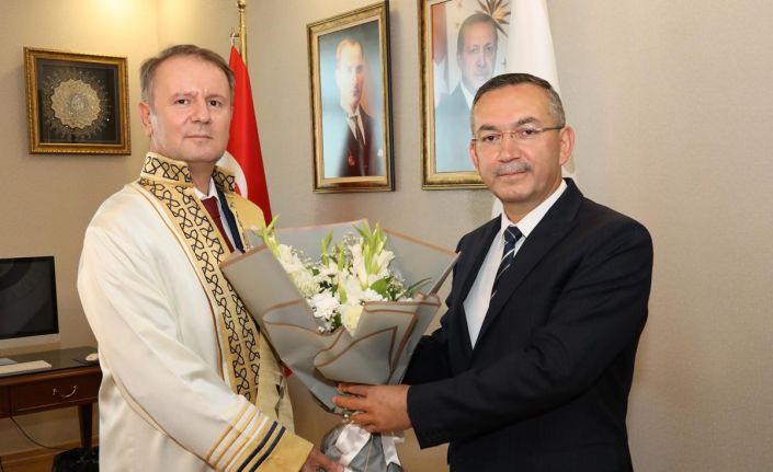 Rektörlük makamında düzenlenen törende Prof. Dr. Ali Akdoğan, Rektör Prof. Dr. Orhan Baş’a rektörlük binişini giydirerek kendisine çiçek takdiminde bulundu.