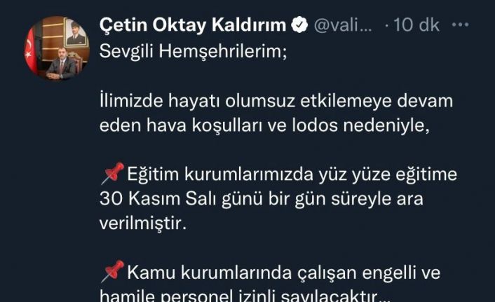 Sakarya Valisi Çetin Oktay Kaldırım, sosyal medya hesabından yaptığı açıklamada, “Sevgili hemşehrilerim ilimizde hayatı olumsuz etkilemeye devam eden hava koşulları ve lodos nedeniyle eğitim kurumlarımızda yüz yüze eğitime 30 Kasım Salı günü bir gün süreyle ara verilmiştir. Kamu kurumlarında çalışan engelli ve hamile personel izinli sayılacaktır” ifadelerine yer verdi.