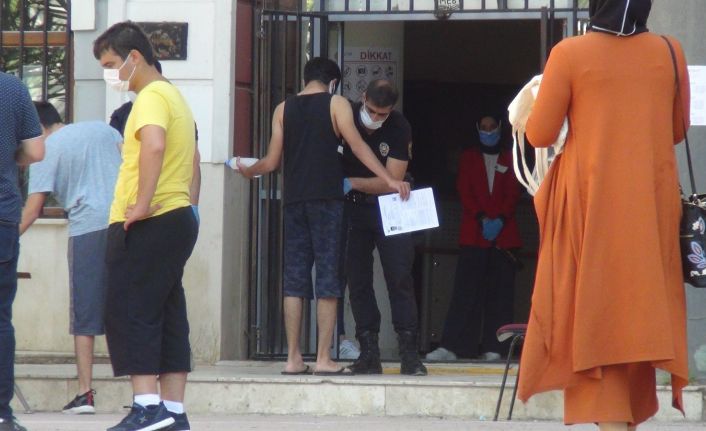 Yığılmayı önlemek ve sosyal mesafeyi korumak için adaylar ve sınav görevlileri dışındakileri okul bahçesine dışına çıkardı.