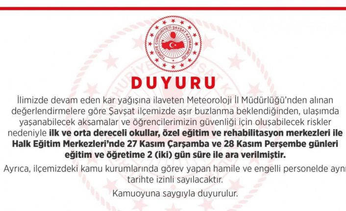 “İlimizde devam eden kar yağışına ilaveten, Meteoroloji İl Müdürlüğünden alınan değerlendirmelere göre Şavşat ilçemizde aşırı buzlanma beklendiğinden, ulaşımda yaşanabilecek aksamalar ve öğrencilerimizin güvenliği için oluşabilecek riskler nedeniyle ilk ve orta dereceli okullar, özel eğitim ve rehabilitasyon merkezleri ile Halk Eğitim Merkezleri’nde 27 Kasım Çarşamba ve 28 Kasım Perşembe günleri eğitim ve öğretime 2 gün süre ile ara verilmiştir. Ayrıca ilçemizdeki kamu kurumlarında görev yapan hamile ve engelli personel de aynı tarihlerde izinli sayılacaktır.”