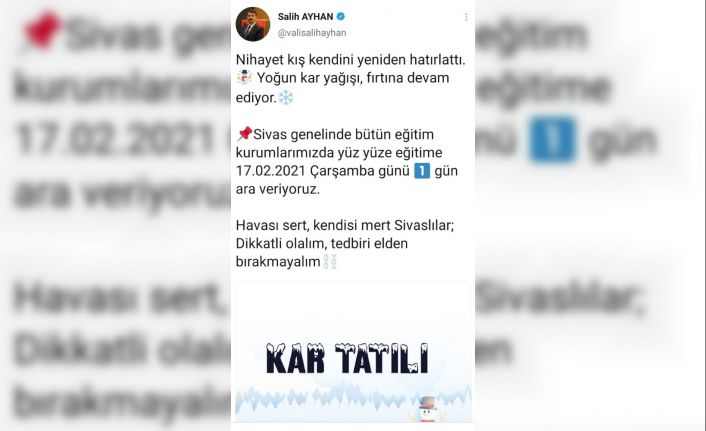 Sivas Valisi Salih Ayhan, sosyal medya üzerinden yaptığı paylaşımda, "Nihayet kış kendini yeniden hatırlattı. Yoğun kar yağışı, fırtına devam ediyor. Sivas genelinde bütün eğitim kurumlarımızda yüz yüze eğitime 17 Şubat 2021 Çarşamba günü 1 gün ara veriyoruz. Havası sert, kendisi mert Sivaslılar; dikkatli olalım, tedbiri elden bırakmayalım” ifadelerine yer verdi.