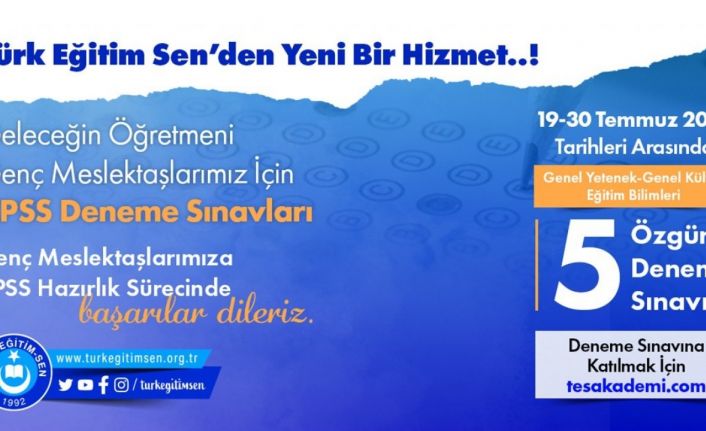 Alanında uzman akademisyen ve eğitimciler tarafından hazırlanan 5 özgün deneme sınavı, www.tesakademi.com üzerinden 19-30 Temmuz 2022 tarihleri arasında öğretmen adaylarının erişimine sunuldu. Bu deneme sınavlarında genel kültür-genel yetenek testi 120 sorudan, eğitim bilimleri de 80 sorudan oluşuyor ve her testte ÖSYM standartlarına göre 200 soru yer alıyor. Konuyla ilgili açıklama yapan Türk Eğitim-Sen Genel Başkanı Talip Geylan, sendikanın sınavlara hazırlık eğitimleri, elektronik kitap desteği ve deneme sınavları hazırladığını hatırlattı. Geylan, bu çerçevede genç meslektaşların talebi üzerine Türk Eğitim-Sen’in KPSS hazırlık sürecinde öğretmen adaylarına deneme sınavları hizmeti vermeye karar verdiğini söyledi. Türk Eğitim-Sen’in bu hizmetinin ücretsiz olduğunu belirten Geylan, şunları kaydetti: