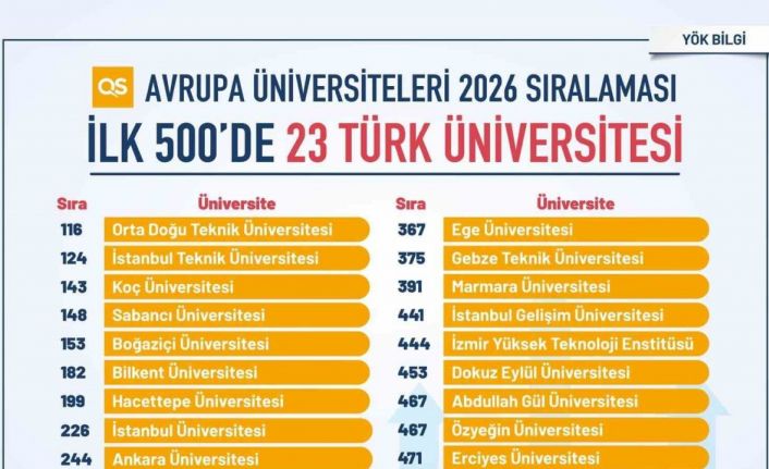 Türkiye, Quacquarelli Symonds (QS) Avrupa Üniversiteleri 2026 sıralamasında 23 üniversitesi ile ilk 500’e girdi.