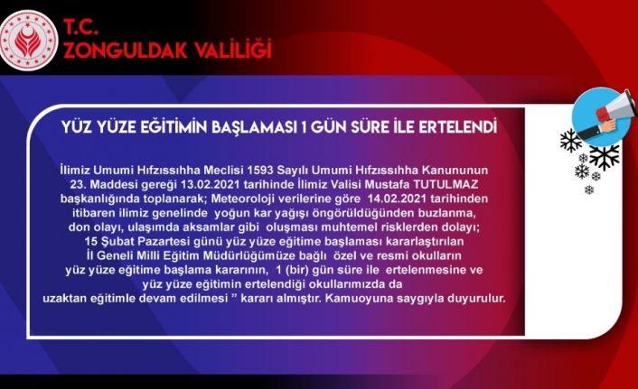 Ardahan’da olumsuz hava koşulları nedeniyle yüz yüze eğitime 1 gün ara verildi. Korona virüs önlemleri kapsamında alınan tedbirlerin ardından yüz yüze eğitime başlanmıştı. Ancak Ardahan’da akşam saatlerinden itibaren başlayan ve devam eden kar yağışı nedeniyle okullar yeniden tatil edildi. Yapılan açıklamada yüz yüze eğitime Perşembe gününe kadar 1 gün ara verildiği belirtildi.