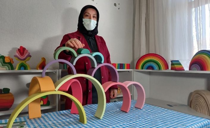 Doğal ahşap oyuncak işine ailesiyle birlikte 1,5 yıl önce başladıklarını ifade eden Şimşek, “Aileden gelen ahşap üzerine işlemlerimiz vardı. Biz bunları daha fazla geliştirerek, ‘nasıl bunları bir eğitim materyalleri haline dönüştürebiliriz?’ diye düşünmeye başladık. Uzun süreli Ar-Ge çalışmalarından sonra bu oyuncakları yapamaya başladık. İlk evimin bodrumunda başladık biz bu işe çocuklarımla beraber ve ilk oyuncağımız gökkuşağı ile başladık. Üretim aşamasını hızlandırdık. Evimizin bodrumu artık bize küçük gelmeye başladı, yerimizi büyüttük” dedi.