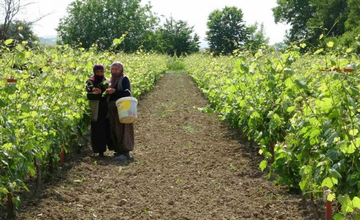 Tokat’ın Pazar ilçesine bağlı Üzümören Beldesinde yaprak hasadı devam ediyor. Kolay pişmesi ve mayhoş tadıyla sofralardan eksik olmayan Üzümören yaprağı yoğun talep görüyor. Sabah saatlerinde başlayan hasat öğlen saatlerinde son bulurken, bu yıl ki hasat da verimin yüksek olması bekleniyor. Hasadın ardından 5 litrelik bidonlara sıkıştırılarak satılan meşhur yaprak, 450 liradan satışa sunuluyor. Fiyat olarak diğer bölgelerin yaklaşık olarak 2 katı fiyata satılan Üzümören yaprağında üreticiler taleplere yetişemiyor.