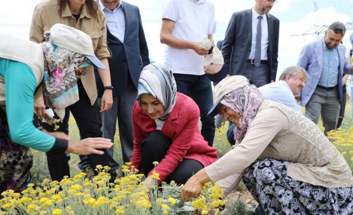Ar-Ge Merkezinin 22 dönümlük alanındaki tıbbi ve aromatik bitkileri inceleyen Vali Yiğitbaşı, kadın işçilerle altınotu hasadı yaptı.
