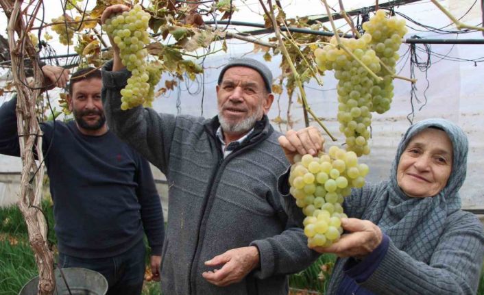 Amasya’da yaşayan Feruziye nine, serasında yetiştirdiği rengarenk üzümleri aralık ayında bile hasat ediyor. Kancı ailesi, haziran ve aralık ayları arasında dalından koparılan üzümleri pazarda kilosu 100 TL’ye varan fiyatlarda satıp kazancını artırdı.