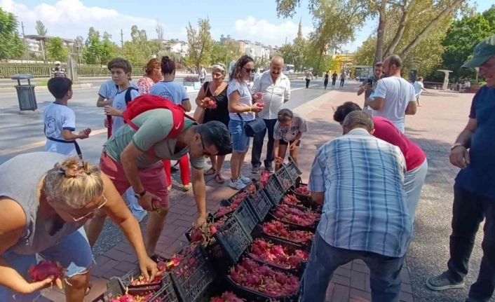 Antalya’da aracıların verdiği fiyatı protesto eden Ejder üreticisi kamyonet dolusu Ejder meyvesini Manavgat Cumhuriyet Meydanı’nda vatandaşlara ücretsiz olarak dağıttı. Ejder meyvesi üreticisi Kamil Arıkan “Pazarda tanesi 5 Euro’ya kadar satılırken, üreticiden kilosunu 40-50 liraya almaya çalışıyorlar. Bu fiyattan onlara vermektense bedava vatandaşa dağıtırım” dedi.