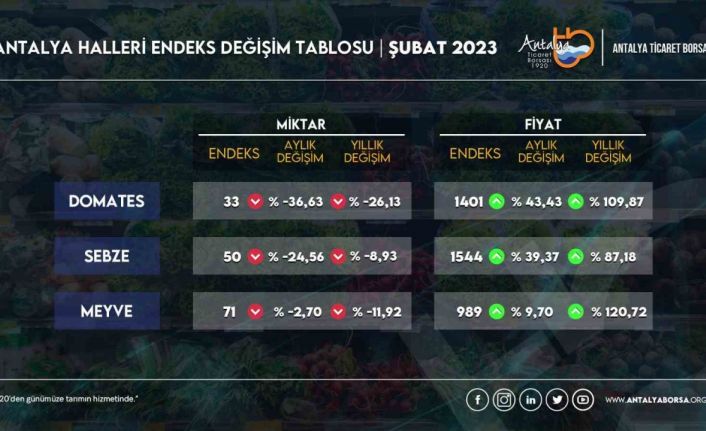 Antalya Ticaret Borsası (ATB), Şubat ayı "Antalya Halleri Domates, Sebze ve Meyve Endeksi"ni açıkladı. Antalya hallerinde işlem gören domates, sebze ve meyvelerin işlem miktar ve fiyatlarıyla ilgili endeks değerleri, 2023 Şubat ayında bir önceki aya ve geçen yılın aynı ayına göre değişim gösterdi.