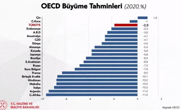 Hazine ve Maliye Bakanı Berat Albayrak, “OECD tahminlerine göre Çin ve Güney Kore’den sonra pandemiden ’en az etkilenecek’ 3’üncü ülke Türkiye" dedi.