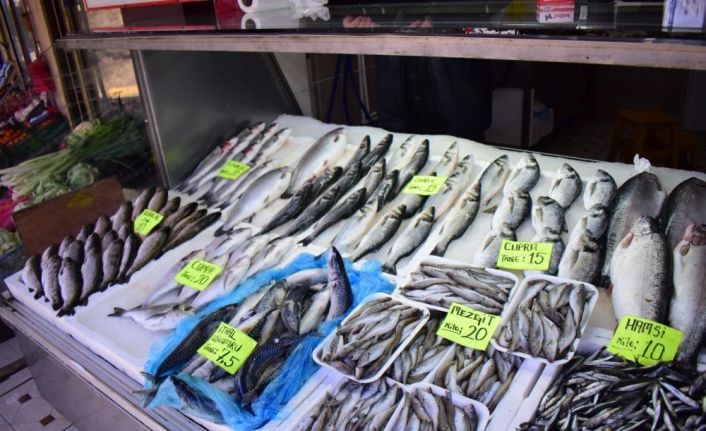 Tezgahlarda balık fiyatları: Mezgitin kilosu 20, hamsinin kilosu 10, çupranın adedi 15, levreğin kilosu da 15 liradan satışa sunulmaktalar.