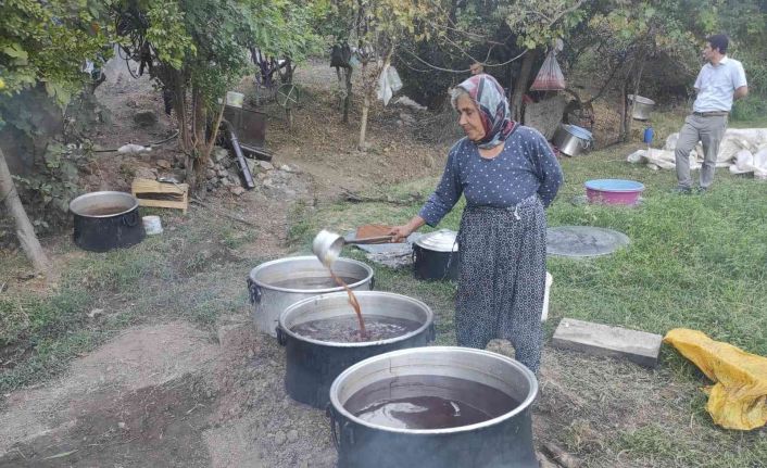 Bağ bozumu ile birlikte bahçelerindeki üzümleri toplayan üreticiler, ayaklarıyla sıktıkları üzüm şırasını yan yana dizdikleri büyük kazanlara koyarak 3 gün boyunca meşe odunu ateşi ile kaynatarak pekmeze dönüştürüyor. Sason ilçesine bağlı Dereköy’de yaşayan vatandaşlar kışlık pekmezleri hazırlamak için hasatlarını tamamladı. Üzümleri hasat eden vatandaşlar çuvallarda geleneksel yöntemlerle üzüm suyunu çıkararak kazanlarda kaynattı. Pekmez için hazır edilen külle birlikte kazanları saatlerce kaynatarak pekmezlerini hazırlayan 75 yaşındaki emektar köy sakini Sakine Çelik, bahçelerinde bin bir emekle yetiştirdikleri kara üzümü hasat ettiklerini söyledi. Çelik, “Bahçemizde bin bir emekle yetiştirdiğimiz kara üzümlerin hasadına başladık. Topladığımız üzümleri eve getirerek bir gün dinlendirdikten sonra dedelerimizin yaptığı gibi, ilkel yöntemlerle ayakla sıkarak şırasını çıkartıp yan yana dizdiğimiz büyük kazanlarda üç gün boyunca altına meşe odunu yakarak kaynatarak organik pekmez elde ediyoruz. Pekmezleri satarak da geçimimizi sağlıyoruz” dedi.