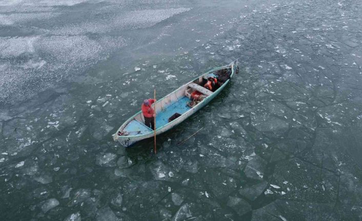 Dondurucu soğuklarda ve buz kütleleri arasından açıklara gidip gelmenin ve avlanmanın zorluklarına da dikkati çeken Yılmaz, “Risk var, tekne delinebilir buzdan böyle havalarda. Oldu da yani birkaç sefer başımıza geldi. Allah korusun ne olacağı belli olmaz. Kış günü tabi. Sis de basabilir, kar yağabilir, şu anda teknoloji geliştiği için cep telefonlarıyla yolumuzu bulabiliyoruz. Eskiden böyle bir şey yoktu, çok sıkıntılıydı. Yine hala akıllı telefon kullanmayanlar da var. Ağlar buza denk gelebilir, parçalanabilir. O yüzden korkumuzdan şu an ağlarımızın yarısını çıkarıyoruz. Gidip geliyoruz avlanmaya ama balık da çok az çıkıyor. Kadife balığı ve 3-5 de sazan var. Ağ serdiğimiz yerler limanımıza yaklaşık 5-6 kilometre mesafede bulunuyor” şeklinde konuştu.