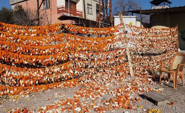 Narenciyenin başkenti Adana’da meyvenin yanı sıra çiftçi, portakal, mandalina ve turunçun kabuğunu çamaşır iplerine asıp kilosunu 20-25 liradan satıyor