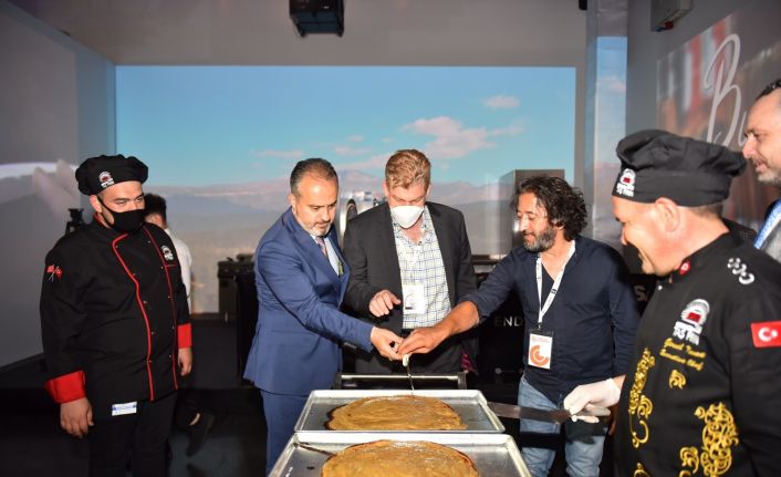 Bursa’nın turizmden daha fazla pay alabilmesi için şehrin sahip olduğu değerleri ulusal ve uluslararası arenada tanıtmak için yoğun çaba harcayan Bursa Büyükşehir Belediyesi, bu kez kentin mutfak kültürünü İstanbul’da tanıttı. İstanbul Kongre Merkezi’nde düzenlenen Gastronomi Turizm Fuarı & Konferansı ‘Gastro Show’da Bursa’nın gastronomi değerlerini yerli ve yabancı misafirlere anlatan Büyükşehir Belediyesi, akşam düzenlenen yemekte de Bursa lezzetlerini davetlilere ikram etti. Bursa’nın eşsiz lezzetleri İnegöl köfte, kestane şekeri, Gedelek turşusu, Bağdat hurma tatlısı, Bursasu, süt helvası, Mustafakemalpaşa tatlısı, tahinli pide, Bursa kebabı, pideli köfte ve Uludağ gazoz, dâvetlilerden tam not aldı.