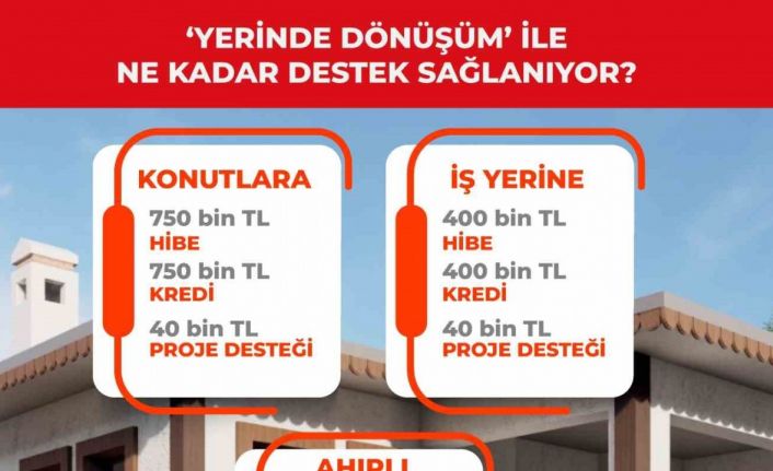 Deprem bölgesindeki konutlara 750 bin lira hibe, 750 bin lira kredi ve vatandaşların proje hazırlığı yaparken kullanabilmeleri için 40 bin lira proje desteği sağlanıyor. İş yerlerine ise 400 bin lira hibe, 400 bin lira kredi ve yine 40 bin lira proje desteği veriliyor. Ahırlı konutlar için 750 bin lira hibe, 1 milyon lira kredi ve 40 bin lira proje desteği sağlanıyor. İlk konut ve iş yeri için Yerinde Dönüşüm desteklerinden faydalanan vatandaşlar 2 ve 3. konut/iş yeri için de 40 bin lira proje desteği ve kredi imkanından faydalanabiliyor.