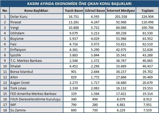 Medya Takip Merkezi, Kasım ayı ekonomi karnesini açıkladı. Rapora göre en çok konuşulan ekonomi başlığı, geçtiğimiz aylarda da olduğu gibi dolar kuru oldu.