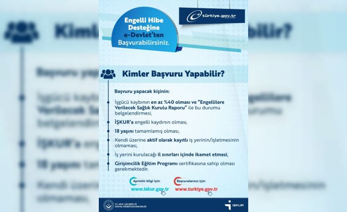 Kendi işini kurmak isteyen engelliler için 65 bin TL’ye varan hibe desteği başvuruları başladı. Engellilere yönelik Hibe Destek Projesi birinci dönem başvuruları 16 Nisan 2021 tarihine kadar devam edecek.