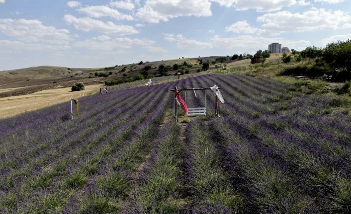 Yaklaşık 6 dönüm alan üzerine ekilen lavantaların çiçeklerinin oluşmasıyla mor renge bürünen tarla, fotoğraf severler için doğal bir stüdyoya dönüştü. Lavantanın mor tonlarını fon yapan ziyaretçiler, en güzel kareleri yakalamaya çalışıyor. Türkiye’nin dört bir yanında gelen ziyaretçiler, tarlalarda oluşturulan farklı dekorlarda fotoğraf çektirmek için birbiriyle yarışıyor.