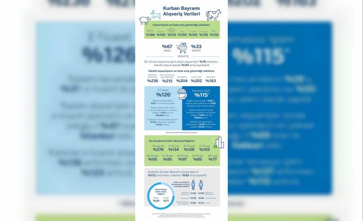 Kurban Bayramı haftasında ödemelerin yüzde 67’si peşin, yüzde 33’ü taksitli şekilde gerçekleştirildi. Araştırmaya göre, bayram kapsamında gerçekleştirilen peşin ödemeler bir önceki yıla oranla yüzde 76 arttı. Taksitli alışveriş verilerine bakıldığında ise yüzde 141’lik bir artış gerçekleştiği gözlemlendi. Taksitli alışverişlerde en çok artış yine mobilya ve dekorasyon sektöründe yüzde 236 oran ile gerçekleşti.