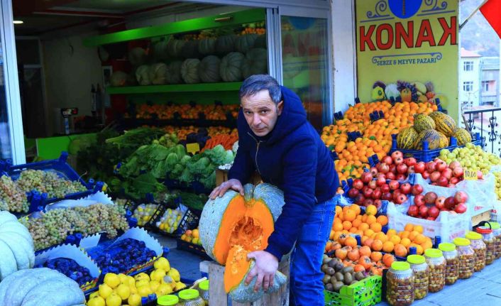 Gümüşhane merkezde 17 yıldır manavlık yapan Mesut Çetin’in dükkanında bulunan devasa bal kabakları yoğun ilgi görüyor. Çetin, Gümüşhane’de yetişen bu dev kabaklar sayesinde işlerinin arttığını söyledi.