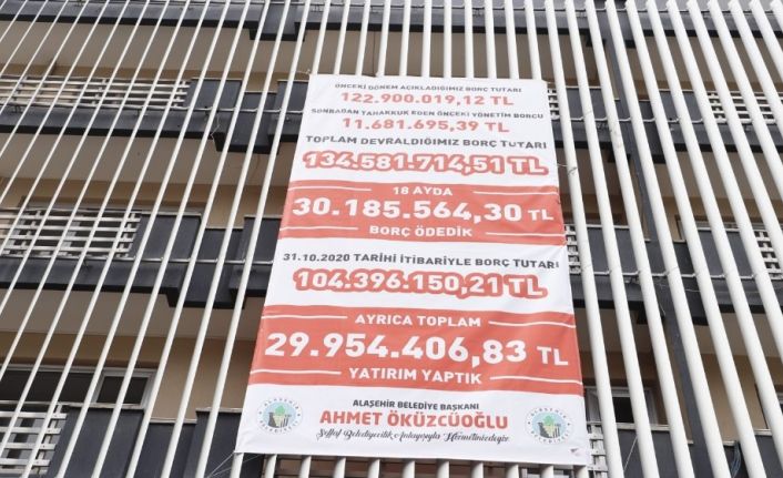 Alaşehir Belediye Başkanı Ahmet Öküzcüoğlu, başkan yardımcıları Halis Özcan, Halil Koç ve Muammer İbişoğlu ile birlikte yaptığı açıklamada, “Daha önce şeffaf olacağımızı, belediyemizin saydam olacağını, bir taraftan bakınca, diğer tarafı da göreceğinizi ve ekonomik tablomuzu da size yıl ve yıl açıklayacağımızı beyan etmiştik. Bununla ilgili geldiğimizde 122 milyon 900 bin TL olarak açıkladığımız borçlarımızın sonradan tahakkuk eden geçmiş döneme ait borçlarla birlikte, toplam borç 134 milyonu aşmıştı. Borç tablomuzu pandemi nedeniyle iki ay gecikmeyle belediye binamıza tekrar astık. 18 ay itibariyle borcumuzu 104 milyon civarına düşürerek yaklaşık 30 milyon TL borç ödemesi gerçekleştirdik.” dedi.