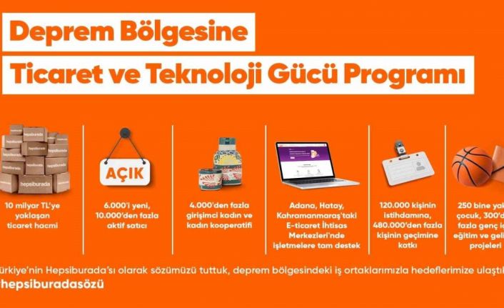 6 binden fazla işletme depremden sonra ilk kez Hepsiburada’yla e-ticaret yapmaya başladı, bölgeden e-ticaret yapan toplam aktif işletme sayısı 10 bini geçti. Programdan yararlanarak e-ticaret yapan girişimci kadın ve kadın kooperatiflerinin sayısı 4 bini aşarken satış hacimleri yaklaşık 675 milyon TL oldu. E-ticaret platformu, kadın odaklı sürdürülebilir kalkınma için UN Women Türkiye ve KAGİDER’le iş birliği yaparak kadın kooperatiflerinin ürünlerini içeren Kadının Emeği Geleceğin Temeli projesini de hayata geçirdi.