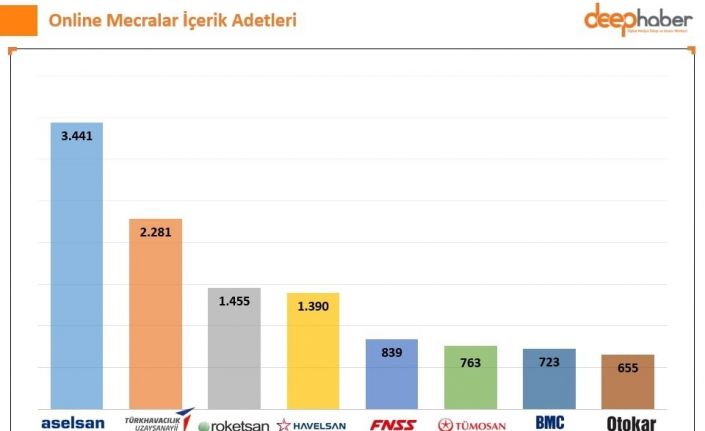 DeepHaber’in 6 günlük raporundan elde edilen verilere göre, savunma sanayii devleri arasında yer alan ASELSAN ‘Online Mecralarda İçerik Adetleri’ kategorisinde 3 bin 441 adetle birinci sırada yer alırken; TUSAŞ 2 bin 281, ROKETSAN bin 455, HAVELSAN bin 390, FNSS 839, TÜMOSAN 763, BMC 723 OTOKAR ise 655 adetle dijital mecralarda yerini aldı.